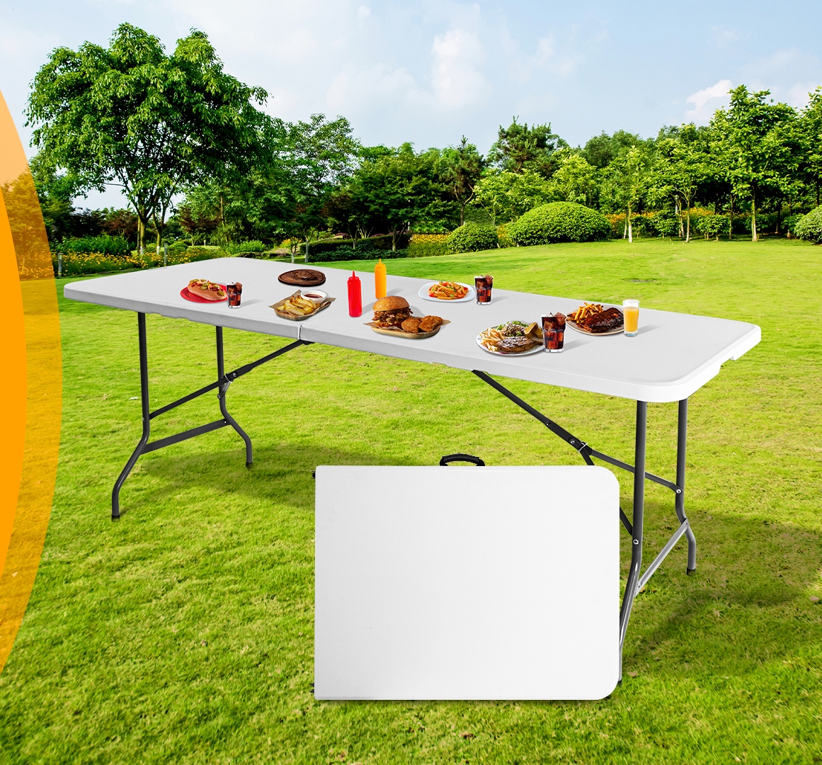 • Mesa Plegable de 2.40m x 76 cm con mantel blanco